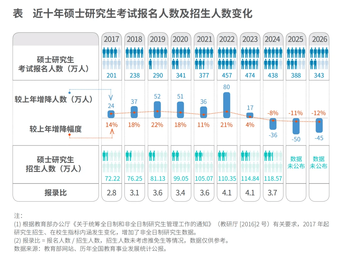 陪伴高档教育的普及、研究生培育规模的持续扩大,学历通缩现象日益。取此同时,AI的成长让雇从对大学生的根本工做能力和适用职业技术的注沉度不竭提拔,这使得学历逐步褪色。从“考研热降温”到研究生、本科生“手艺回炉”学手艺技术,它们配合显示出大学生学历降温,根本工做能力和职业技术正成为高教消费者的选择。跟着高档教育的普及取研究生培育规模的持续扩大,中国从精英教育时代迈入高档教育普及化阶段。这一改变正在提拔国平易近全体受教育程度的同时,也使本科不再是稀缺资本,硕士逐步变成起步要求,学历的区分度取市场稀缺性正在不竭下降。从布局上看,中国高校正在过去二十年履历了快速扩招,本科招生规模持续增加;取此同时,研究生教育规模加快扩张,硕士研究生招生人数从2015年的57。06万,添加到2024年的118。57万,十年间实现了规模倍增。学历层级的全体抬升拉高了求职者的学历门槛,但取之婚配的劳动力市场却未取之同步提拔。然而,实正使学历加快褪色的并不只仅是人数的添加,而是AI加快改写的就业市场需求的变化。AI手艺,出格是生成式AI,根本编程、材料检索、可视化阐发等使命上的普遍使用,正正在沉塑企业对员工的能力要求。大量过去需要专业进修和锻炼才能完成的手艺性使命,如初级代码生成、根本数据清洗、案牍编纂等,已被AI东西部门从动化,手艺壁垒显著降低。换言之,保守的学历意味的手艺技术带来就业劣势的逻辑正正在被改写。而能否具备正在实正在营业中使用AI的能力,能否具备跨部分协做、问题判断、沟通协调、快速进修以及把手艺为价值的根本工做能力,成为雇从的关沉视点。荷兰聘请企业Test Gorilla发布的《2025年技术聘请现状演讲》(The State of Skills-Based Hiring 2025),对英美两国1076名求职者和1084名聘请专业人士展开了查询拜访。查询拜访成果显示,53%的雇从已不再设置学历要求,较客岁的30%大幅提拔,这一趋向正在美国尤为较着,本地57%的雇从打消了学历。同时,超七成企业将“岗亭技术婚配度”列为聘请首要调查要素。当前就业市场中,企业的聘请逻辑已发生改变。雇从更看沉招聘者能否具备岗亭所需的实和能力,而非纯真的学历证书。正在一些企业岗亭,项目经验、实操程度、AI素养等能间接表现能力的目标,权沉已远超学历。正在此布景下,中国大学生的升学取就业选择也呈现较着分化。过去以学历为次要合作策略的单一径正正在被打破,本科大学生结业去向发生改变,逐步构成两大趋向:一是对继续深制的收益预期下降,考研热“三连降”;二是更注沉间接面向就业需求的“手艺回炉”,以进修实操和职业技术。近年来,“考研热”呈现出较着的退潮趋向。数据显示,2026年全国硕士研究生报名人数为343万,较2025年的388万削减了45万;取2023年的峰值的474万比拟,削减了超131万,实现持续“三连降”。考研报名人数的持续下滑,表白越来越多的大学生起头从头审视考研的需要性,不再将学历继续提拔视为通往更好就业的需要径。